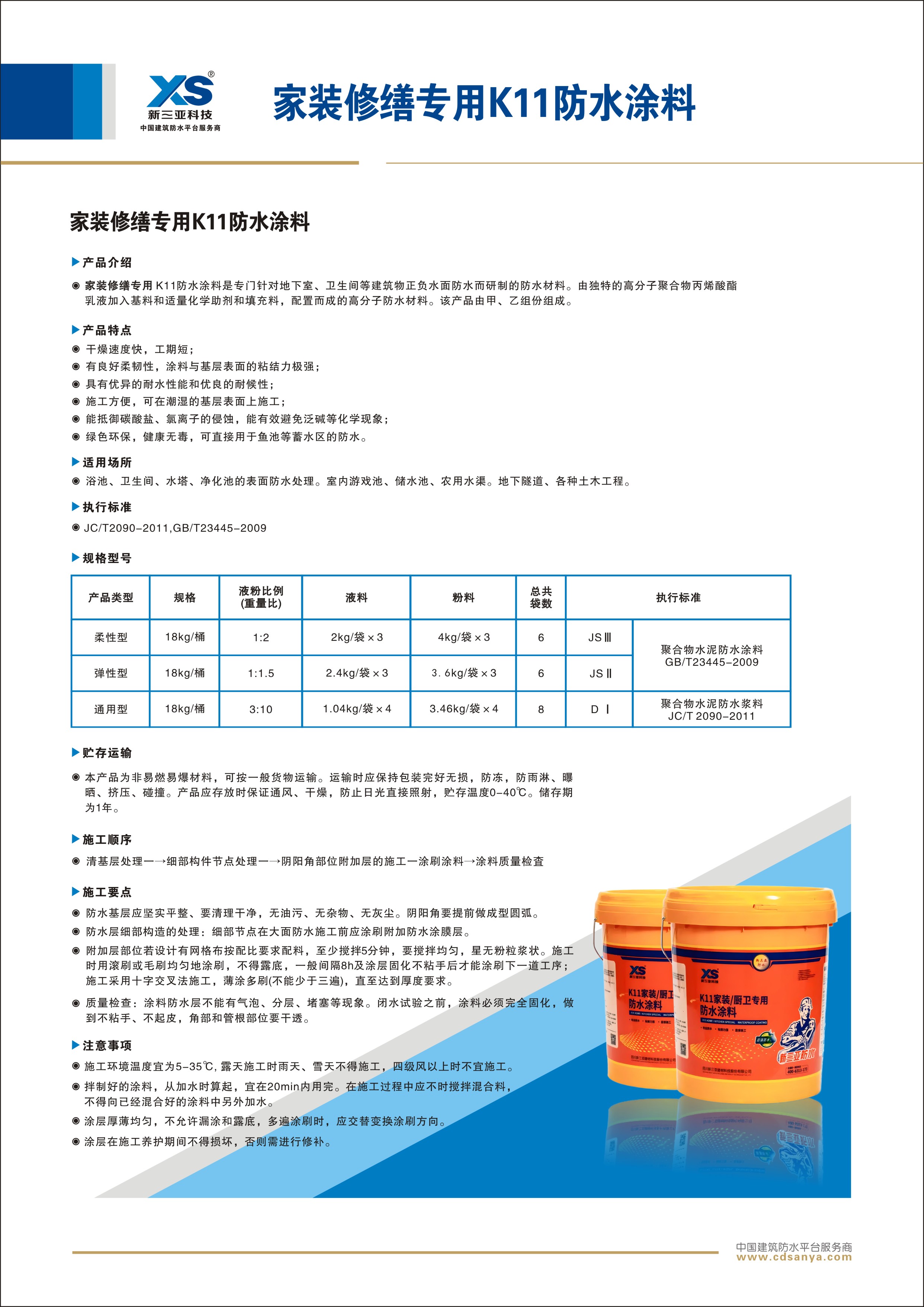產品簡介: 家裝修繕專用K11防水涂料是專門針對地下室、衛生間等建筑物正負水面防水而研制的防水材料。由獨特的高分子聚合物丙烯酸酯乳液加入基料和適量化學助劑和填充料,配置而成的高分子防水材料。該產品由甲、乙組份組成。 規格:18kg/桶 | ![]() |